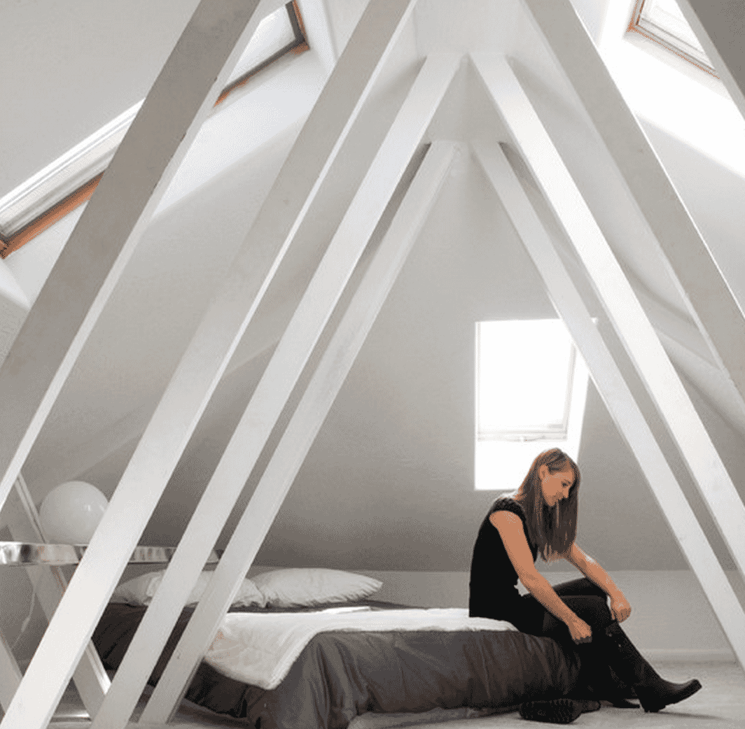 Greys and whites are fabulous shades for creating the illusion of space, typically when space is tight. The inclusion of painted trusses adds a quirky feel that not only looks unique, it also reacts with the daylight in a dynamic way; casting dapples of light and playing with the idea of form and void to construct a space that comes across as clean and weightless. The shape of a room isnt typically dictated by colour, but here you can see how white lines have been used to build this porcelain-looking temple.